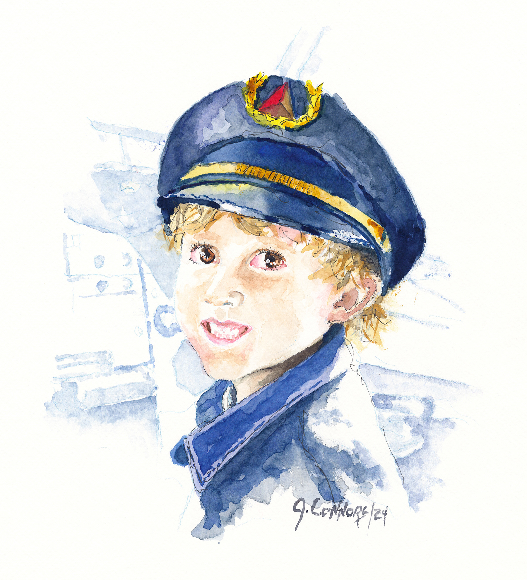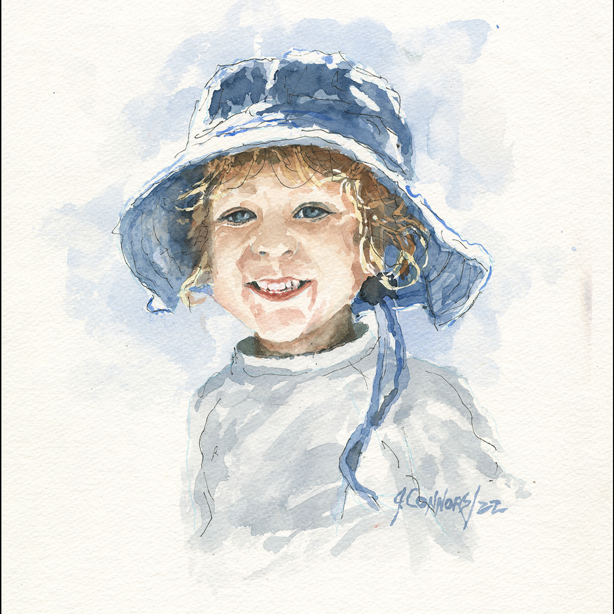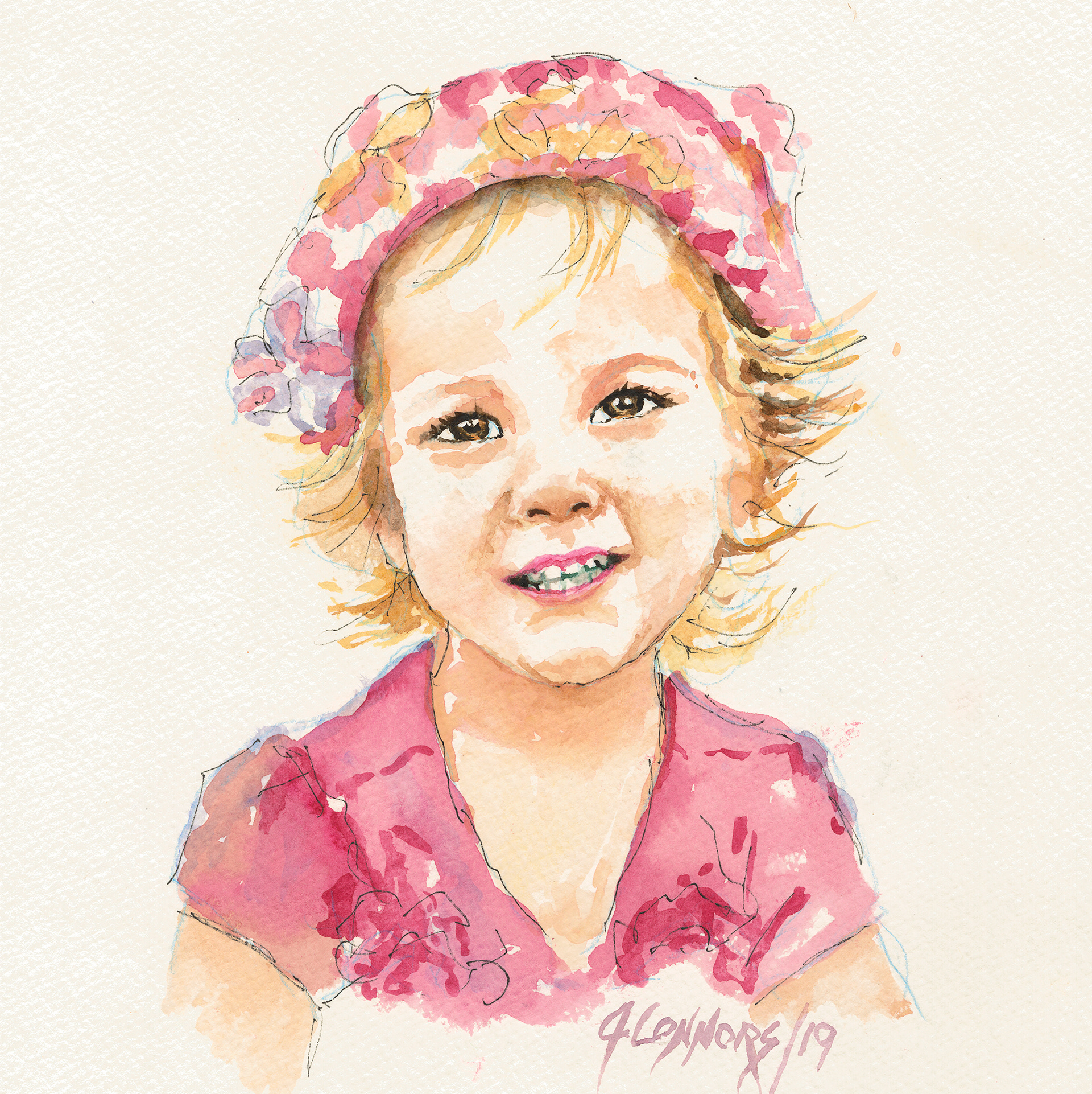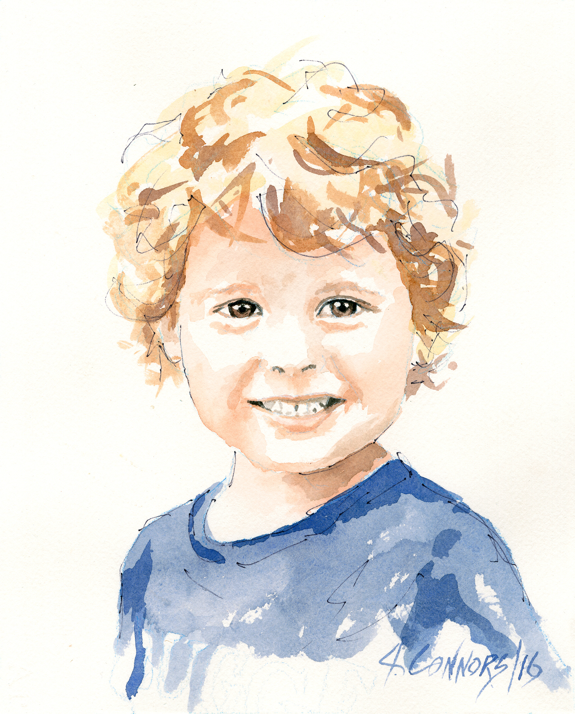 Children’s portraits can focus on specific details that capture their playful nature: a twinkle in their eye, the tousled hair, or a bright smile. Watercolor allows John the ability to highlight these moments in a gentle, non-intrusive way.